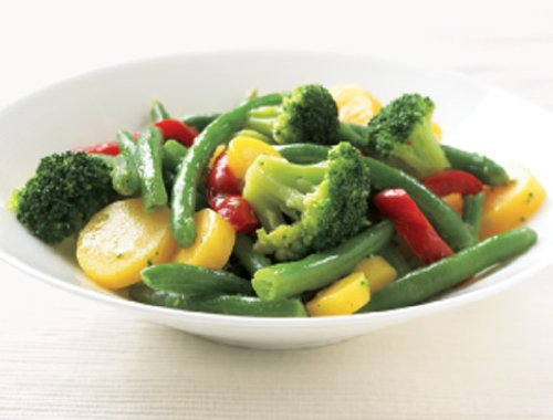 A colorful vegetable blend of broccoli florets, whole green beans, sliced yellow carrots and red bell peppers in a flavorful lemon garlic seasoning.Lemon Garlic Seasoned Vegetable BlendItem Brand